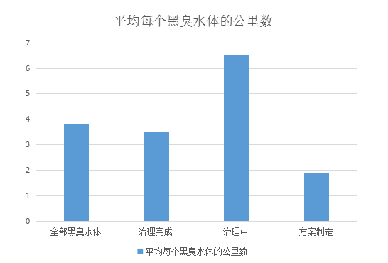 可以發(fā)現(xiàn),相比于已經(jīng)治理完成的水體和方案制定中的水體,治理中的水體平均每個(gè)的公里數(shù)明顯偏高。