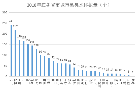 下圖為依據(jù)全國(guó)城市黑臭水體整治監(jiān)管平臺(tái)數(shù)據(jù)而來(lái)的2018年各省市城市黑臭水體數(shù)量圖: